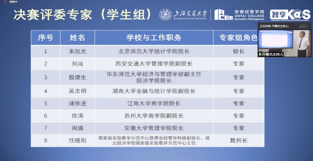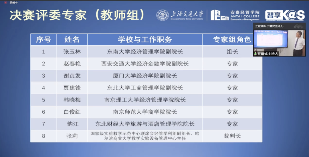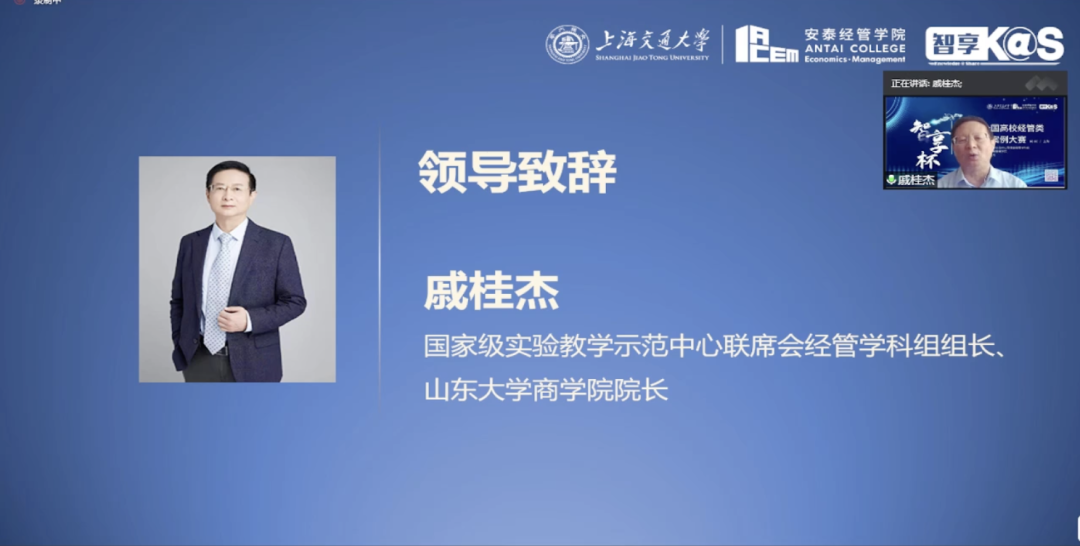 戚桂杰教授感谢了各位专家评委,表达了对承办方上海交通大学安泰经管学院工作的高度评价和感谢,并感谢协办方北京百智享科技有限公司对案例大赛的长期支持。接着,向参赛选手和在线观看直播的师生介绍大赛机制与创新点,大赛环节及亮点,专家评审环节的优化创新等。最后预祝各位参赛选手取得好成绩。