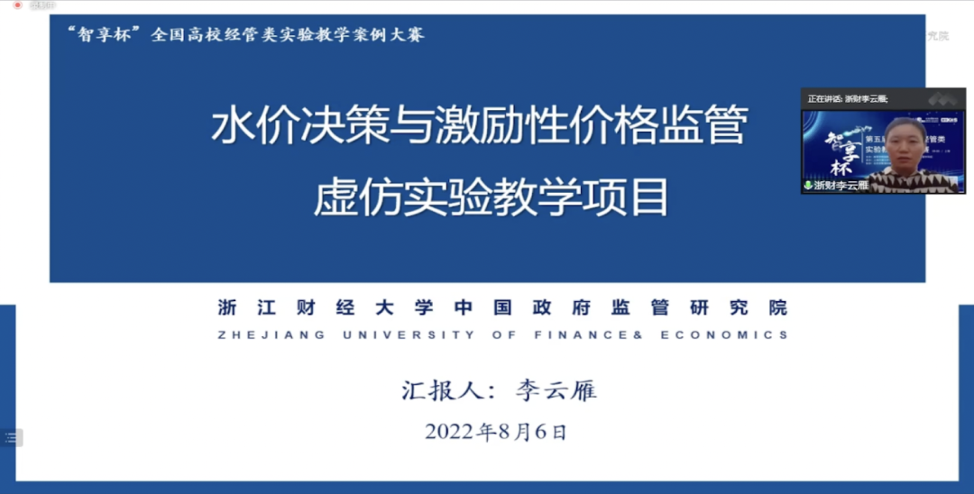 分组答辩结束后,进行往届获奖案例分享专家报告环节,由中国高等教育学会高等财经教育分会副秘书长李海龙主持。来自浙江财经大学的李云雁博士分享了第四届经济组二等奖案例:《水价决策与激励性价格监管虚仿实验教学项目》。