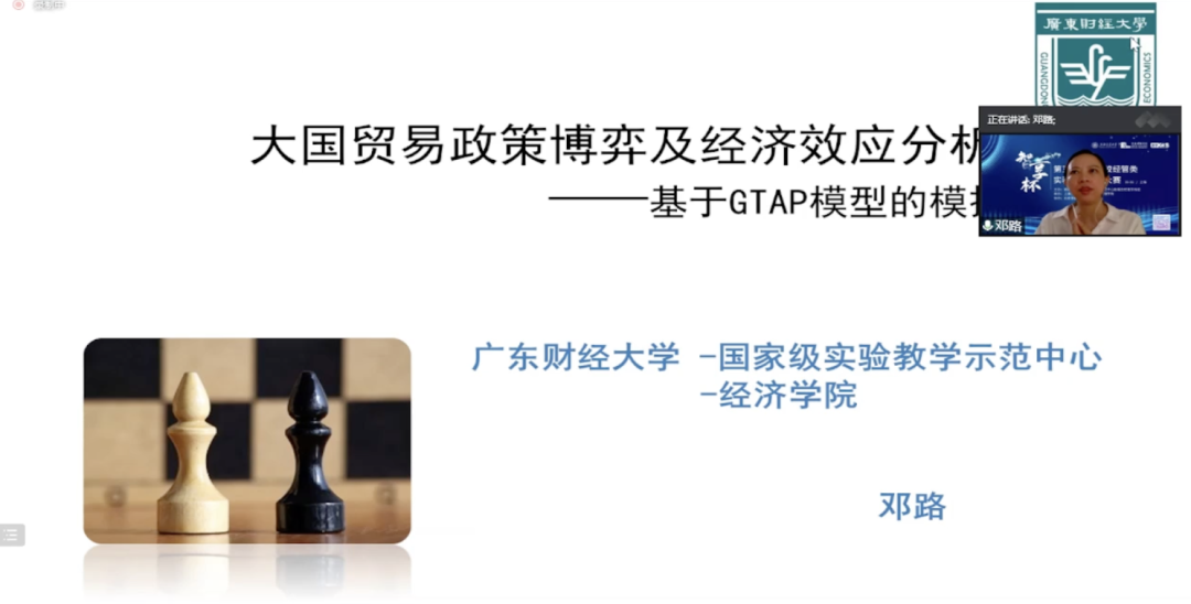 来自广东财经大学的邓路博士分享了第三届案例大赛经济组一等奖案例:《大国贸易政策博弈及经济效应分析——基于GTAP模型的模拟》。(注:两个分享案例均被开发为虚拟仿真项目,并被认定为教育部首批经管类国家级虚拟仿真金课)