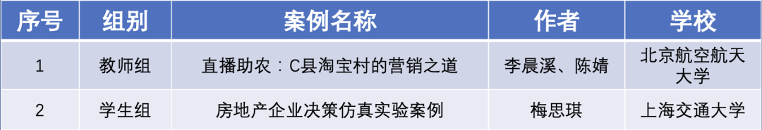 获得特等奖的是教师组:北京航空航天大学李晨溪、陈婧团队的《直播助农:C县淘宝村的营销之道》,以及学生组:上海交通大学梅思琪的《房地产企业决策仿真实验案例》,指导教师井润田教授。