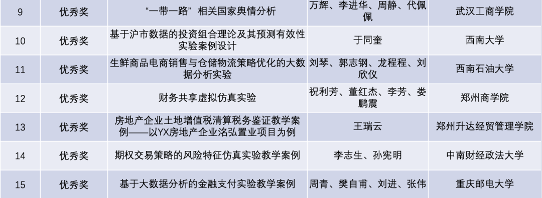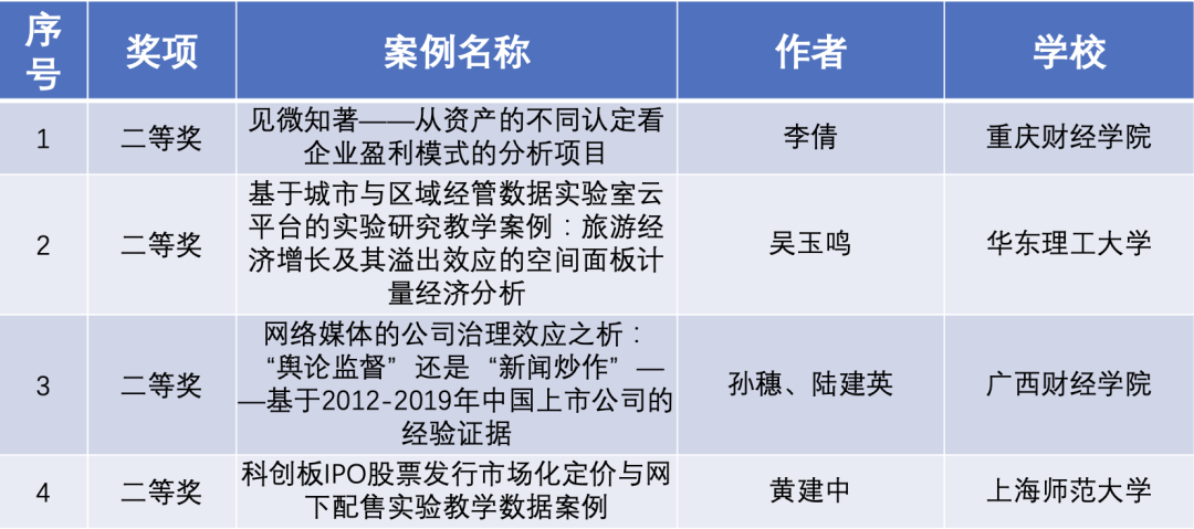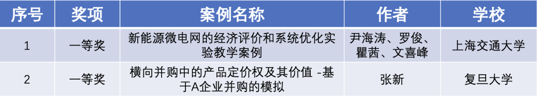 接下来,公布的是一等奖获得者,分别是教师组:上海交通大学尹海涛、罗俊、瞿茜、文喜峰团队的《新能源微电网的经济评价和系统优化实验教学案例》;复旦大学张新团队的《横向并购中的产品定价权及其价值 -基于A企业并购的模拟》。