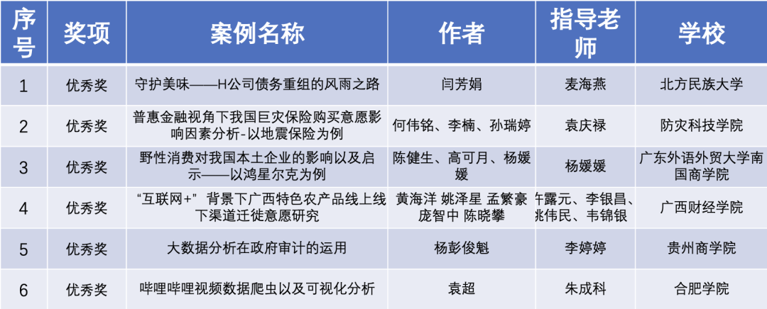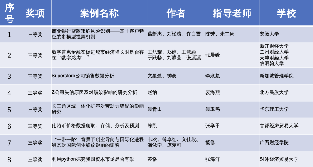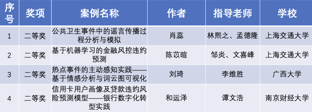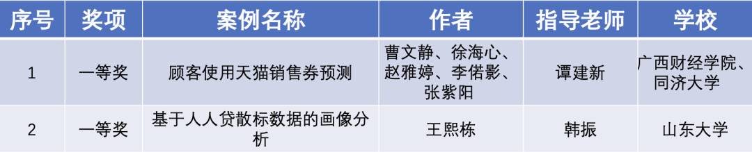 学生组:广西财经学院曹文静等、同济大学张紫阳团队的《顾客使用天猫销售券预测》,指导教师谭建新;山东大学王熙栋团队的《基于人人贷散标数据的画像分析》,指导教师韩振。