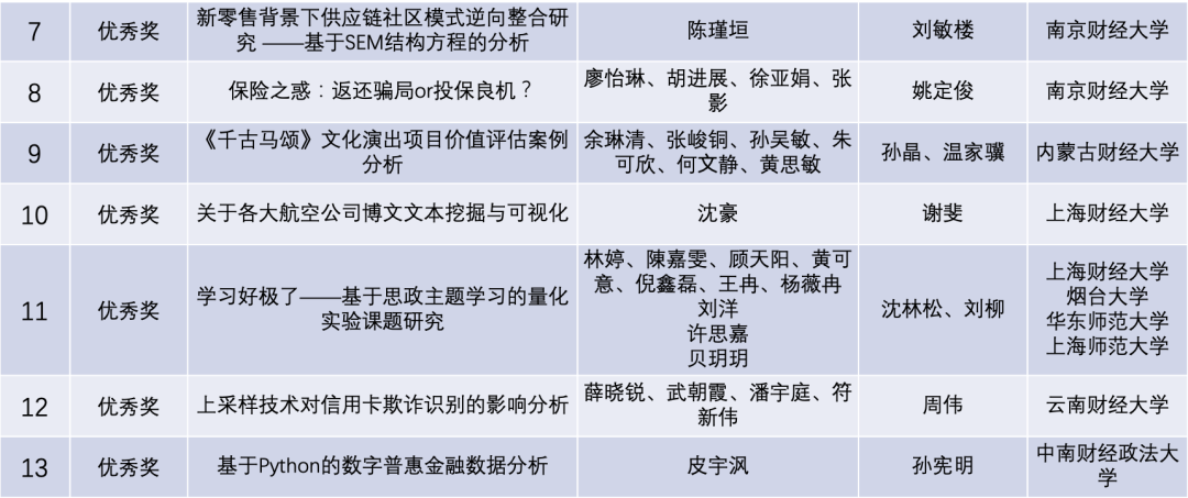 学生组评委分别是:北京师范大学统计学院院长宋旭光,西安交通大学管理学院副院长刘汕,华东师范大学经济与管理学部副主任、经济学院院长殷德生,湖南大学金融与统计学院副院长吴志明,江南大学商学院院长浦徐进,苏州大学商学院副院长徐涛,安徽大学管理学院院长周瑛。