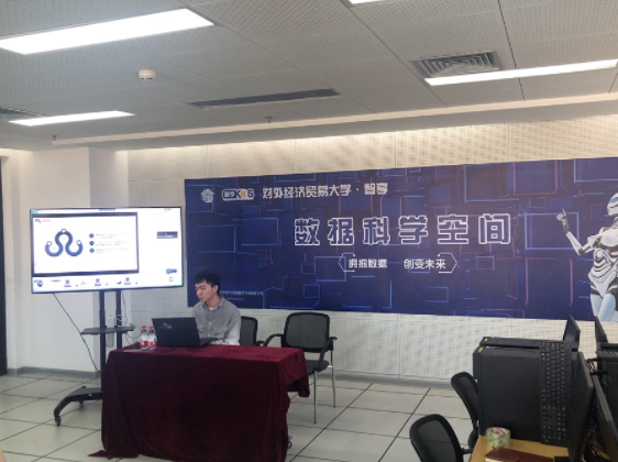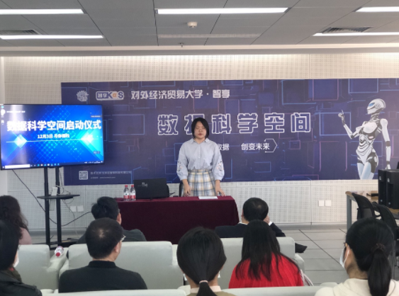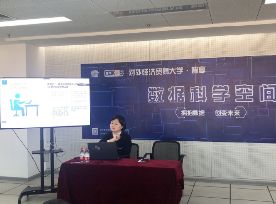 本部分报告由对外经济贸易大学图书馆电子阅览室主管涂育红老师进行,报告主题为《数据科学空间能给我们带来什么》,涂老师在报告中详细介绍了数据科学在财经教育领域中日益显著的地位,并详细介绍了“对外经济贸易大学·智享数据科学空间”总体布局、功能,以及数据科学空间对学生在大学求学生涯中的积极作用。