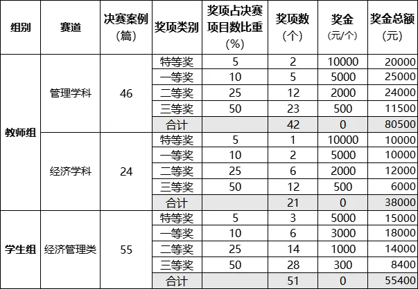 大赛按照案例作品来源设教师组和学生组两个类别,教师组下设经济学科、管理学科2个赛道,学生组下设经济管理类学科1个赛道。