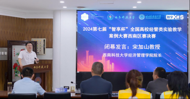 颁奖环节结束后,西南科技大学经济管理学院院长宋加山致答谢辞,对本次大赛的支持、五位现场评委的辛勤付出以及选手的积极参与表示了感谢。